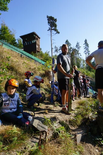 Das absolute Highlight war jedoch die Trainingseinheit mit den großen Skisprungprofis wie Karl Geiger, Stephan Leyhe, Selina Freitag, Katharina Schmid und Co.. Neben den derzeit aktiven Sportlern waren auch ehemalige Weltklasse-Springer wie Martin Schmitt und Severin Freund vor Ort, was nicht nur die Herzen der jungen Athleten, sondern auch die der anwesenden Eltern höherschlagen ließ. Auch Werner Schuster, der ehemalige A-Kader-Trainer, war anwesend. Er ist derzeit im Nachwuchsbereich tätig und hielt für die Eltern der Kinder einen inspirierenden Vortrag über die Rolle der Eltern im Sport.